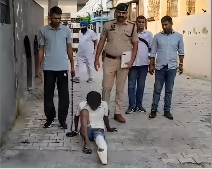 यमुनानगर: हरियाणा के यमुनानगर जिले में पुलिस का अनोखा और सख्त स्टाइल देखने को मिला। 13 सितंबर को साढ़ौरा में एक घर पर फायरिंग कर दहशत फैलाने वाले बदमाश को पुलिस द्वारा टांग पर चोट लगने के बावजूद चेन से बांधकर सीधे मौके पर निशानदेही के लिए लाया गया। आरोपी की टांग पर पलास्टर था, जिससे वह खड़ा भी नहीं हो पा रहा था, लेकिन पुलिस ने उसे चेन में बांधकर बैठे बैठे ही गलियों में चलवाया। आरोपी बदमाश ने शायद कभी सपने में भी नहीं सोचा होगा कि जिस घर पर वह बाइक पर सवार होकर दहशत फैलाने आया था, वहां पुलिस उसे इस तरह लाएगी।