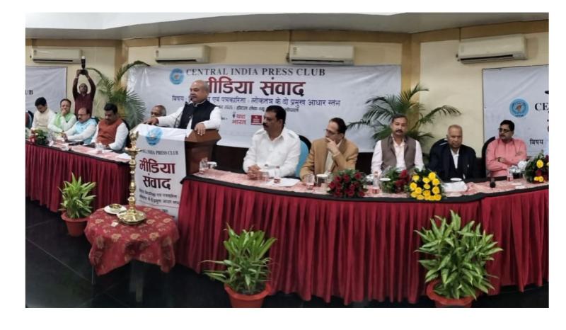 भोपाल: राजधानी के होटल लेक व्यू अशोका में रविवार को सेंट्रल इंडिया प्रेस क्लब (पब्लिक ट्रस्ट) द्वारा आयोजित “मीडिया संवाद एवं दीपावली मिलन” कार्यक्रम में प्रदेशभर के पत्रकारों और जनप्रतिनिधियों ने भाग लिया। इस वर्ष का विषय था “विधायिका एवं पत्रकारिता - लोकतंत्र के दो प्रमुख आधार स्तंभ।”