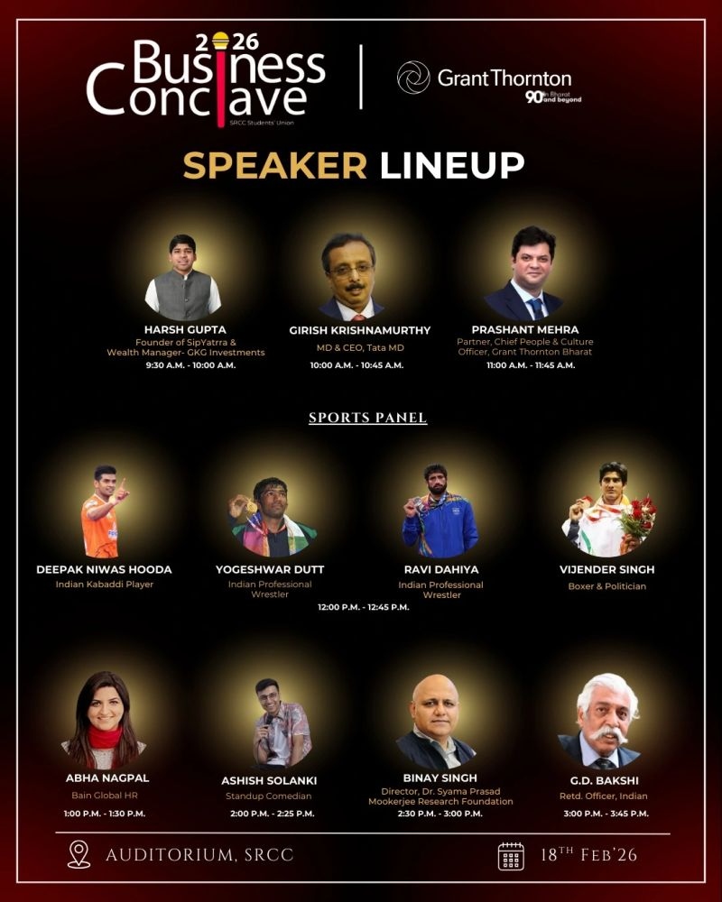 विशेष रूप से प्रोडक्ट मैनेजमेंट और मार्केटिंग चैलेंज में छात्रों ने अपने नवाचार और व्यावसायिक समझ का प्रदर्शन किया, जबकि केस स्टडी और पॉलिसी फॉर्मूलेशन में उनके आलोचनात्मक सोच और निर्णय क्षमता की परीक्षा हुई। कार्यक्रम में बड़ी कंपनियों और इंडस्ट्री लीडर्स ने हिस्सा लिया और छात्रों के प्रदर्शन की सराहना की। यह आयोजन छात्रों के लिए सीखने और नेटवर्क बनाने का एक शानदार अवसर साबित हुआ, जिससे उन्हें वास्तविक उद्योग परिदृश्यों में काम करने का अनुभव मिला। साथ ही, केंद्रीय मंत्री मनोहर लाल खट्टर, अनुराग ठाकुर, चीफ इकोनॉमिक एडवाइजर डॉ. वी. अनंथा नागेश्वरन, फसाई के विशेषज्ञ, गेमिंग क्रिएटर्स, कॉर्पोरेट लीडर्स जैसे कई पावरफुल स्पीकर्स ने छात्रों को प्रेरित किया। इसके अलावा मनोरंजन के लिए कॉमेडियन, अभिनेता, सोशल मीडिया इंफ्लूएंसर ने छात्रों को तरोताजा किया। कॉन्क्लेव के आखिरी दिन एयर स्टाफ के चीफ अमर प्रीत सिंह ने बिजनेस में लीडरशिप, साहस, सतत प्रयास का पाठ पढाया। फिक्स डर्मा की संस्थापक शैली मेहरोत्रा और निविया की मैनेजिंग डायरेक्टर गीतिका मेहता ने बिजनेस में महिला को सामना करने वाली चुनौतियों पर चर्चा की। ग्रांट थॉर्नटन पैनल में स्टार्टअप, ट्रैडिंग, इंवेस्टमेंट और अन्य पहलुओं पर छात्रों को जागरूक किया। इसके अलावा अन्य स्पीकर्स ने भी बिजनेस से संबंधित छात्रों की उलझनों पर चर्चा के साथ समाधान पर भी जोर दिया। ऐसे में माहौल को हल्का करने के लिए बेनाम और रहस्य म्यूजिक बैंड ने छात्रों को अपनी धुन पर नचाया। इसी के साथ बिजनेस कॉनक्लेव 2026 ने देशभर से हजारों छात्रों को व्यापार की समझ में बड़ा योगदान दिया।